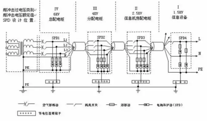 交流配电系统耐冲击电压类别以及用社保电子浪涌保护器分级保护示意图