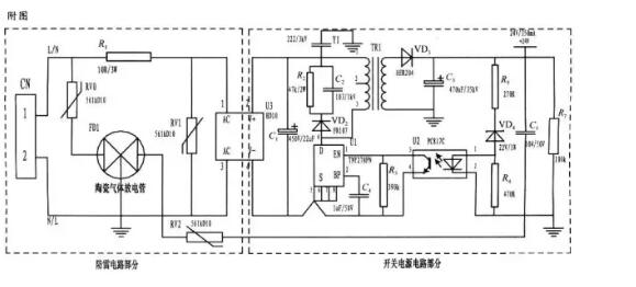 陶瓷气体放电管的通流容量根据要求的通流容量选择,电路采用3RM470L-7.5-L,通流量为5000A。线绕电阻R1起限流分压作用;贴片整流模块为开关电源电路前端整流作用,C1为高压滤波电容,Y1为去耦电容,电阻R2和电容C2及VD2组成开关电源芯片MOS管的吸收钳位电路,保护芯片,开关电源芯片采用PI公司的TNY27系列,TR1为高频变压器,VD3、C3构成高频变压器次级滤波,U2、VD4、R3、R4、R5构成开关电源电路的反馈电路,可将变压器次级输出电压稳定在设计值,此防雷抗浪涌电路在实际使用中取得了较好的效果。