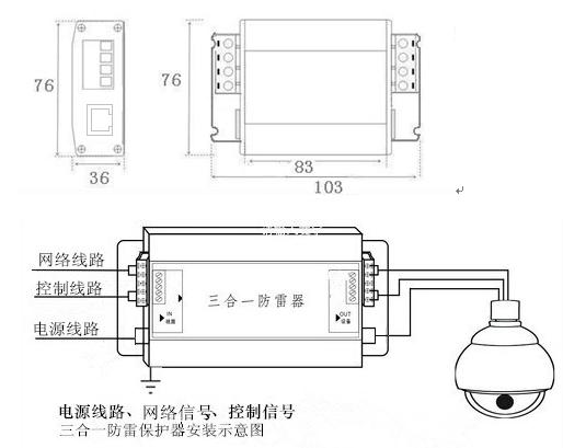 *按防雷器指示将网络线,电源线,分别接在防雷器输入端,用连接线把防雷器输出端与摄像机网络端口、电源接口连接。用接地线将接地端子与接地装置连接。将防雷器用螺丝挂在墙上,并固定好。