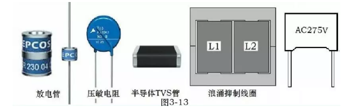 、氧化锌压敏电阻、半导体闸流管(TVS)、浪涌抑制电感线圈、X类浪涌抑制电容等,各种器件要组合使用。